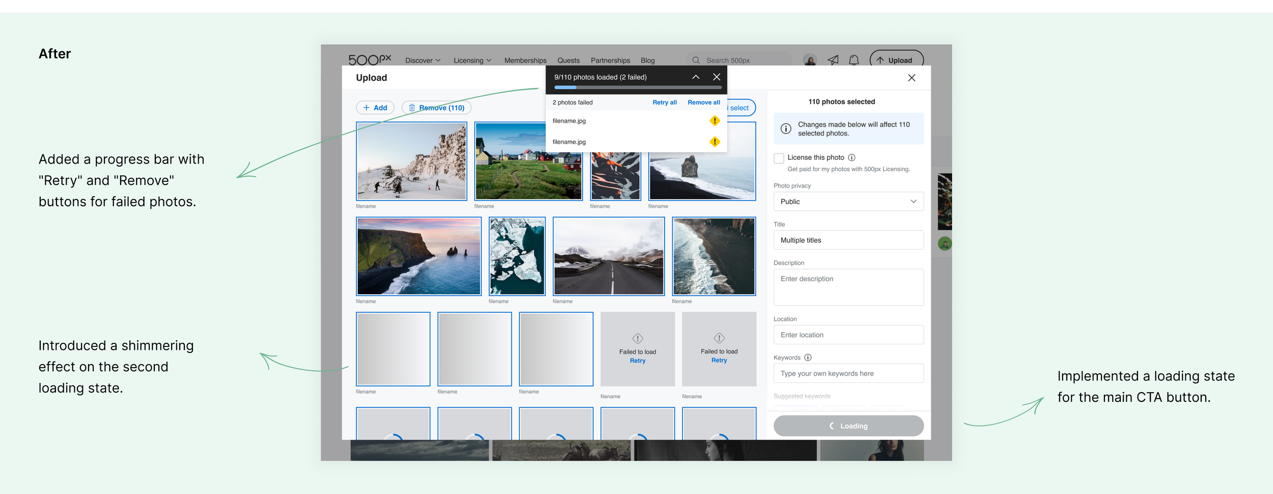 After launch, the upload success rate dropped to 75%. We discovered that uploading 100+ photos at once caused the UI to appear frozen, causing early abandonment.